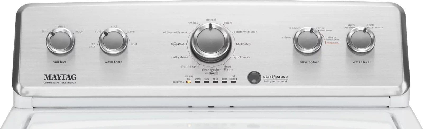 Simplify laundry day with this Maytag top-loading washer. Its 3.8 cu. ft. capacity is large enough to handle everything in your hamper, and its PowerWash agitator cleans loads efficiently to eliminate stains. This Maytag top-loading washer has an Auto Sensing function for automatic adjustment of the water level, and its Quick Wash cycle helps you save time.