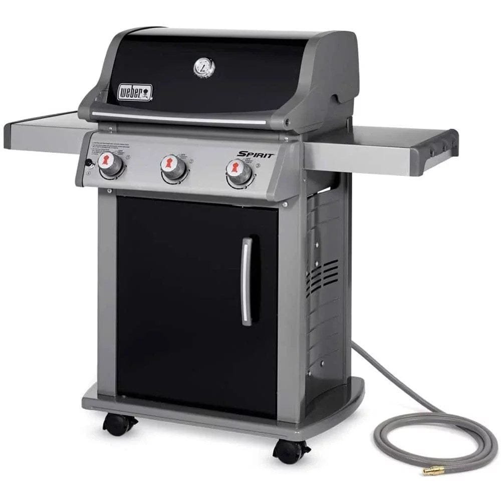 - This grill is equipped with a thermometer, a side shelf, and a removable drip tray.